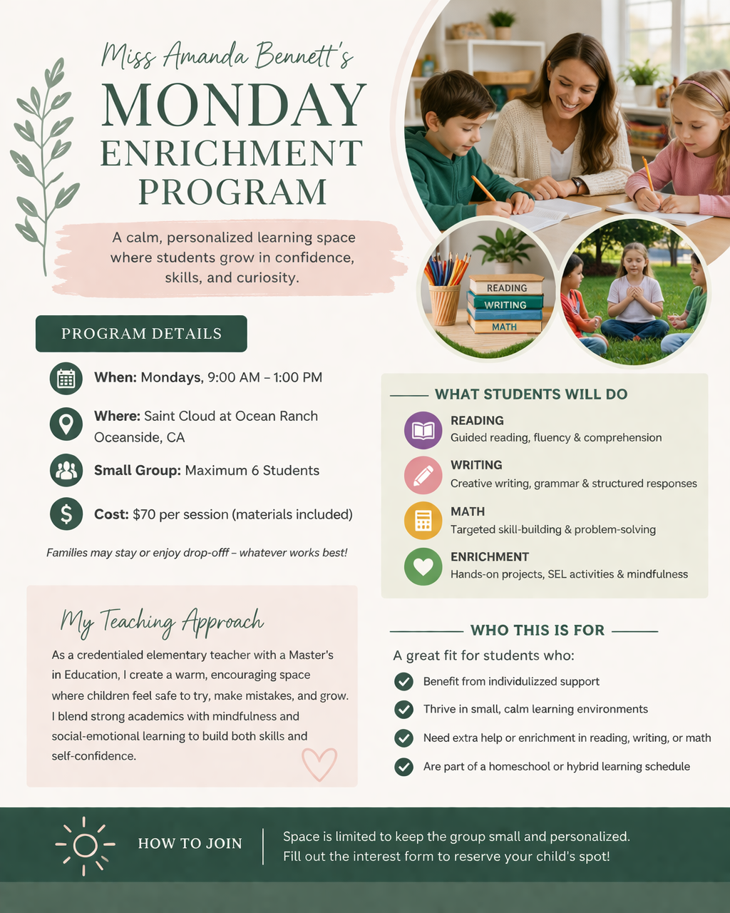 Monday Enrichment Sessions are designed for families looking for meaningful academic support in a warm, small-group setting. Each child receives individualized attention, targeted instruction, and encouragement in an environment that feels focused, peaceful, and joyful. Families are welcome to either stay during the session or treat it as a drop-off program—whatever feels most comfortable.